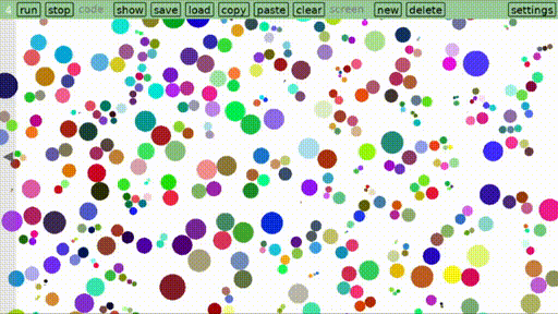 Last night I encountered the work of Karsten Schmidt, and was inspired to reimplement a tiny part of the merest superficial sample of his huge project. It doesn't actually implement any flocking dynamics yet, and I'm also not implementing Karsten's tasteful color gradients. To my surprise, it's quite snappy even on a large screen to quadratically scan all balls for each ball's neighbors.
