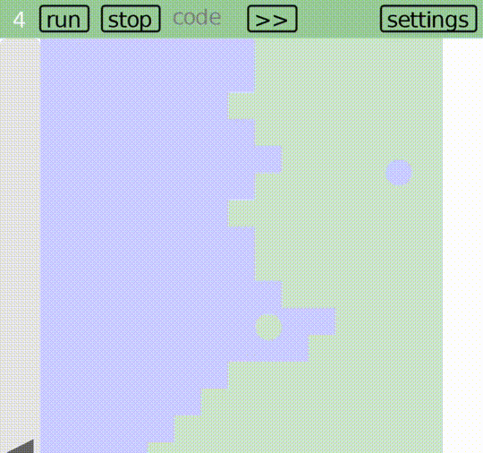 local n = 20 -- px per square local v = 200 -- ball velocity in px/s -- initialize a w*h board randomly with one of 2 states local w = floor((Safe_width-60)/n) local h = floor(Safe_height/2/n) local board = {} for y=1,h do local row = {} for x=1,w do table.insert(row, rand(1,2)) end table.insert(board, row) end local px = (Safe_width-n*w)/2 -- initialize colors for the 2 states local c1 = {0.8, 0.8, 1} local c2 = {0.8, 0.9, 0.8} colors = {c1, c2} -- initialize 2 balls local b1 = {x=0, y=floor(n*h/2)} local b2 = {x=n*w, y=floor(n*h/2)} balls = {b1, b2} -- region color to ball within it -- give each ball a unit velocity in a random direction function randNorm2() local p = {x=rand(-100,100), y=rand(-100,100)} local m = math.sqrt(p.x^2 + p.y^2) return {x=p.x/m, y=p.y/m} end b1.v = randNorm2() b2.v = randNorm2() function car.draw() for y=1,h do for x=1,w do color(unpack(colors[board[y][x]])) rect('fill', px+(x-1)*n, Menu_bottom+(y-1)*n, n,n) end end color(unpack(c2)) circle('fill', px+balls[1].x, Menu_bottom+balls[1].y, n/2) color(unpack(c1)) circle('fill', px+balls[2].x, Menu_bottom+balls[2].y, n/2) end function car.update(dt) for c,b in ipairs(balls) do if b.v.x < 0 and (b.x < 1/2*n or maybe_set_board(b.x-1/2*n, b.y, c)) then b.v.x = abs(b.v.x) elseif b.v.x > 0 and (b.x > (w-1/2)*n or maybe_set_board(b.x+1/2*n, b.y, c)) then b.v.x = -abs(b.v.x) elseif b.v.y < 0 and (b.y < 1/2*n or maybe_set_board(b.x, b.y-1/2*n, c)) then b.v.y = abs(b.v.y) elseif b.v.y > 0 and (b.y > (h-1/2)*n or maybe_set_board(b.x, b.y+1/2*n, c)) then b.v.y = -abs(b.v.y) end b.x = b.x + v*b.v.x*dt b.y = b.y + v*b.v.y*dt end end function maybe_set_board(x, y, c) x, y = s(x), s(y) if board[y][x] == c then return end board[y][x] = c return true end function s(z) return 1+floor(z/n) end