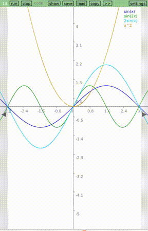 run_screen('ticks') v = {x=-5, y=-5*Safe_height/Safe_width} v.w, v.h = -2*v.x, -2*v.y v.zoom = Safe_width/v.w f,s = nil -- ids of first and second touches start, curr = {}, {} -- coords of touches initzoom = nil initpos = nil -- for panning function car.draw() draw_axes() color(0,0,1) plot(sin) color(0,0.6,0) plot(function(x) return sin(2*x) end) color(0,0.8,1) plot(function(x) return 2*sin(x) end) color(0.8,0.6,0) plot(function(x) return x^2 end) draw_hud() end function plot(f) local prev_vy = vy(f(sx(0))) for vx=1,Safe_width do local curr_vy = vy(f(sx(vx))) line(vx-1, prev_vy, vx, curr_vy) prev_vy = curr_vy end end function draw_axes() color(0.5,0.5,0.5) line(0, vy(0), Safe_width, vy(0)) line(vx(0), 0, vx(0), Safe_height) local xlo, xhi = ticks(sx(0), sx(Safe_width)) for i=0,10 do local x = xlo+i/10*(xhi-xlo) local vx, vy = vx(x), vy(0) line(vx, vy, vx, vy+5) g.print(x, vx-10, vy+10) end local ylo, yhi = ticks(sy(Menu_bottom), sy(Safe_height)) for i=0,10 do local y = ylo+i/10*(yhi-ylo) local vx, vy = vx(0), vy(y) line(vx, vy, vx+5, vy) g.print(y, vx+10, vy+5) end end function draw_hud() local w = App.width('sin(2*x)') local y = Menu_bottom+10 color(0,0,1) g.print('sin(x)', Safe_width-w-35, y) y = y+Line_height color(0,0.6,0) g.print('sin(2x)', Safe_width-w-35, y) y = y+Line_height color(0,0.8,1) g.print('2sin(x)', Safe_width-w-35, y) y = y+Line_height color(0.8,0.6,0) g.print('x^2', Safe_width-w-35, y) color(0.5, 0.5, 0.5) for _,touch in ipairs(touches()) do if curr[touch] then circle('fill', curr[touch].x, curr[touch].y, 10) end end end function car.touchpressed(id, x,y, ...) if f == nil then f = id initpos = {x=v.x, y=v.y} else s = id initzoom = v.zoom end start[id] = {x=x, y=y} curr[id] = {x=x, y=y} end function car.touchreleased(id, x,y, ...) f,s = nil start, curr = {}, {} initzoom = nil initpos = nil end function car.touchmoved(id, x,y, ...) if start[id] then curr[id] = {x=x, y=y} if s then local oldzoom = v.zoom v.zoom = dist(curr[f], curr[s])/dist(start[f], start[s])*initzoom adjust_viewport(oldzoom, v.zoom) elseif f then v.x = initpos.x + iscale(start[f].x - x) v.y = initpos.y - iscale(start[f].y - y) end end end function adjust_viewport(oldzoom, zoom) -- ensure centroid of fingers remains in view local c = centroid(curr[f], curr[s]) v.x = v.x + c.x/oldzoom - c.x/zoom v.y = v.y + c.y/oldzoom - c.y/zoom end function centroid(a, b) return{x=(a.x+b.x)/2, y=(a.y+b.y)/2} end function dist(p1, p2) return ((p2.x-p1.x)^2 + (p2.y-p1.y)^2) ^ 0.5 end function vx(sx) return scale(sx-v.x) end function vy(sy) return Safe_height - scale(sy-v.y) end function scale(d) return d*v.zoom end function sx(vx) return v.x + iscale(vx) end function sy(vy) return v.y + iscale(Safe_height-vy) end function iscale(d) return d/v.zoom end