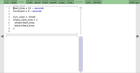 Start_time = 12 -- seconds Curr_color = 'white' Chess_clock_time = { white=Start_time, black=Start_time, } function car.update(dt) Chess_clock_time[Curr_color] = math.max(0, Chess_clock_time[Curr_color] - dt) end -- initialize space per side local side_w = floor((Safe_width-60 - 100)/2) -- initialize font size local function font_size_for_chess_clock() local font_size local min_font_size = 20 local max_font_size = Safe_height for i=1,100 do if min_font_size >= max_font_size-5 then break end font_size = floor((min_font_size+max_font_size)/2) local font = g.newFont(font_size) local w = font:getWidth('00:00:00') if w < side_w then min_font_size = font_size elseif w > side_w then max_font_size = font_size elseif w == side_w then break end end return font_size end local font_size = font_size_for_chess_clock() local font = g.newFont(font_size) function car.draw() g.setFont(font) local top = Menu_height+20 local left = 30 local height = Safe_height-80 local gutter_width = 100 -- white side local time = Chess_clock_time.white if time <= 0 then color(1,0,0) rect('fill', left, top, side_w, height, 5,5) else color(0.2,0.2,0.2) rect('line', left, top, side_w, height, 5,5) end local white_time = time_str(time) local w = g.getFont():getWidth(white_time) if time == 0 then color(1,1,1) elseif time < 10 then color(1,0,0) else color(0,0,0) end local x = left + (side_w - w)/2 local y = top+(height-font_size)/2 g.print(white_time, x,y) -- black side time = Chess_clock_time.black if time <= 0 then color(1,0,0) else color(0.2,0.2,0.2) end local black_time = time_str(time) local w = g.getFont():getWidth(black_time) x = left + side_w + gutter_width rect('fill', x, top, side_w, height, 5,5) if time == 0 then color(0,0,0) elseif time < 10 then color(1,0,0) else color(1,1,1) end x = x + (side_w - w)/2 g.print(black_time, x,y) end function time_str(time) if time < 10 then local tens = floor(time/10) local fractional_part = time - tens return ('%d%0.2f'):format(tens, fractional_part) end local hours = floor(time/3600) time = time - hours*3600 assert(time < 3600) local minutes = floor(time/60) time = time - minutes*60 assert(time < 60) local seconds = floor(time) return ('%02d:%02d:%02d'):format(hours, minutes, seconds) end function car.mouse_press(x,y, b) if Chess_clock_time.white == 0 or Chess_clock_time.black == 0 then return end if y >= Menu_height + 20 then if Curr_color == 'white' then -- it's white's move if x <= 30+side_w then Curr_color = 'black' end else -- it's black's move if x >= 30 + side_w + 100 then Curr_color = 'white' end end end end